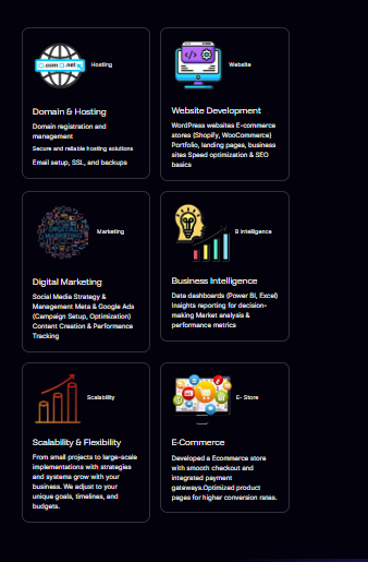Every business is unique and so is its journey. Whether you’re just starting out, looking to establish your online presence, or ready to expand into new markets, our solutions grow with you. From web design and hosting to digital marketing, e-commerce, and business intelligence, we build flexible strategies that adapt to your needs.